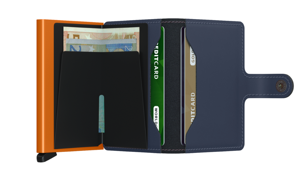 Small in size and surprisingly large in storage capacity, the Miniwallet combines the best of both worlds. The exterior holds banknotes, receipt and cards, while the aluminium Cardprotector allows you to slide out cards with one simple motion and protects them from bending, breaking and unwanted wireless communication.